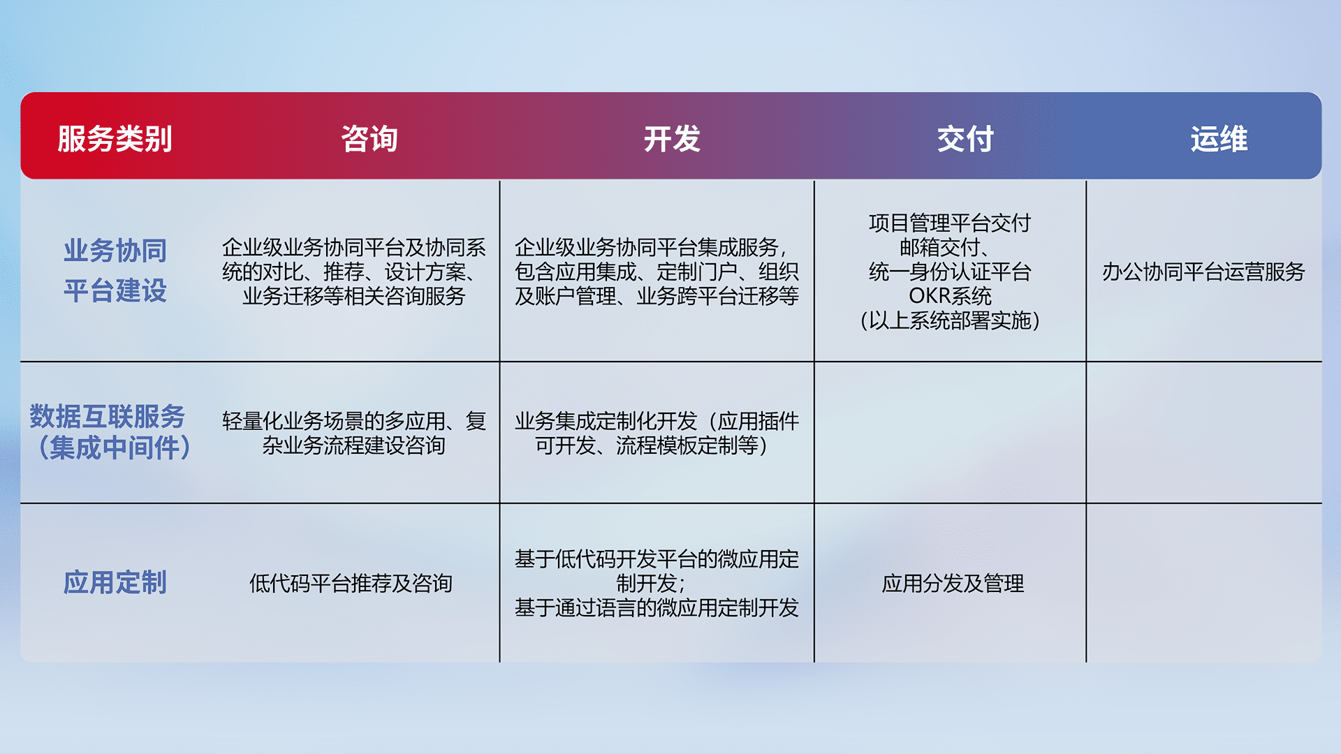 基于全代码低代码的数字化应用系统开发及交付,,,满足特定业务场景的应用开发及集成,,,,提升企业业务信息化及数字化能力。。