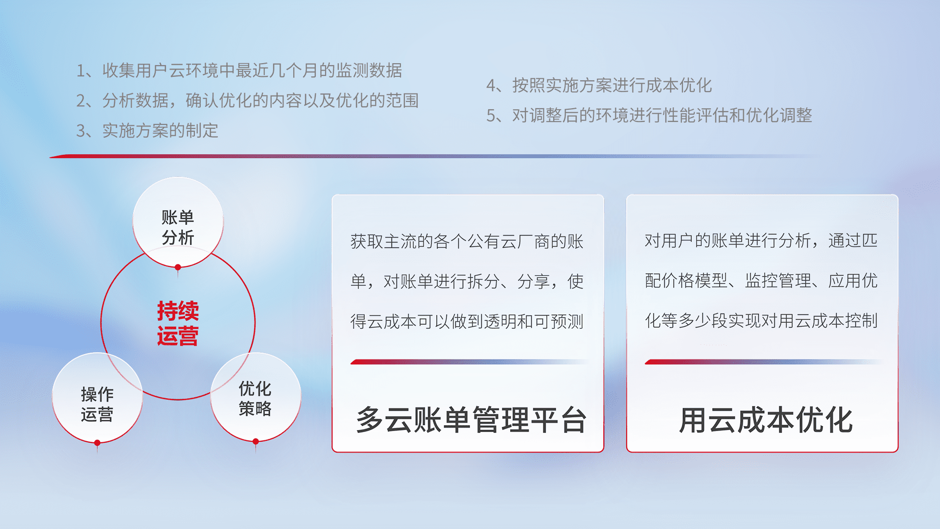 通过多云纳管,,以统一的资源数据模型把客户的云资源进行抽象和封装,,进而实现对多云资源的统一操作,,,保障云资源管理的可靠性、、稳定性与可用性。。量身定制化运维内容,,,,配置、、、开发运维、、补丁管理、、备份、、、、监控、、、、认证和访问管理、、、、审计和日常巡检等,,,保障在用云过程中的可靠度,,,稳定度以及高可用率。。。。